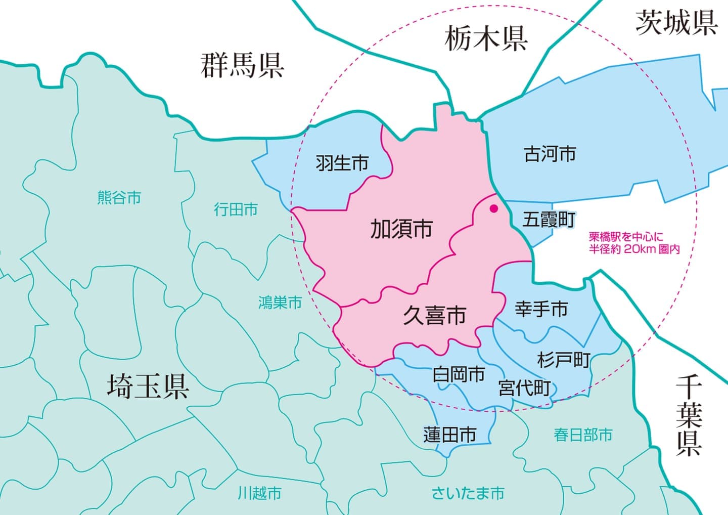 JR宇都宮線・東武日光線「栗橋駅」を中心に半径20km圏内